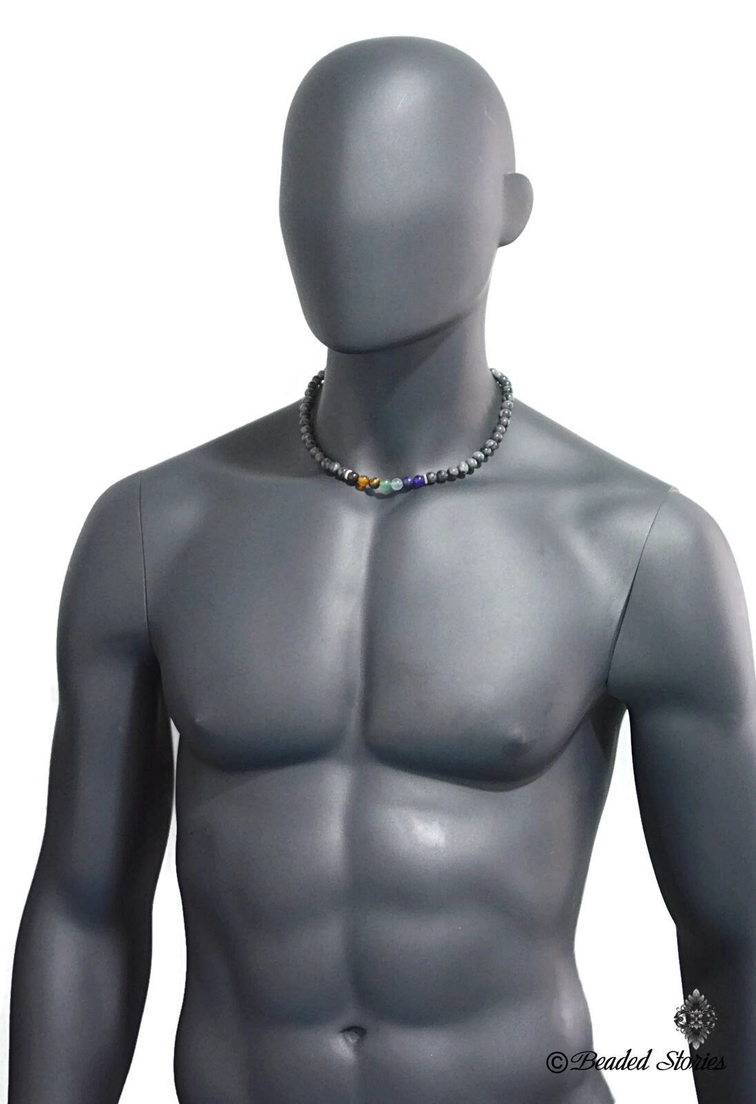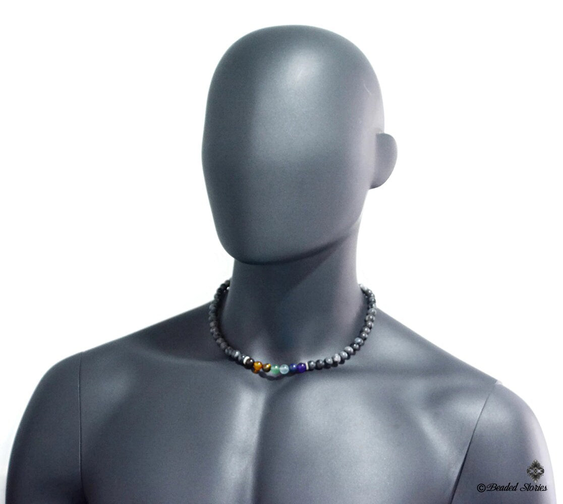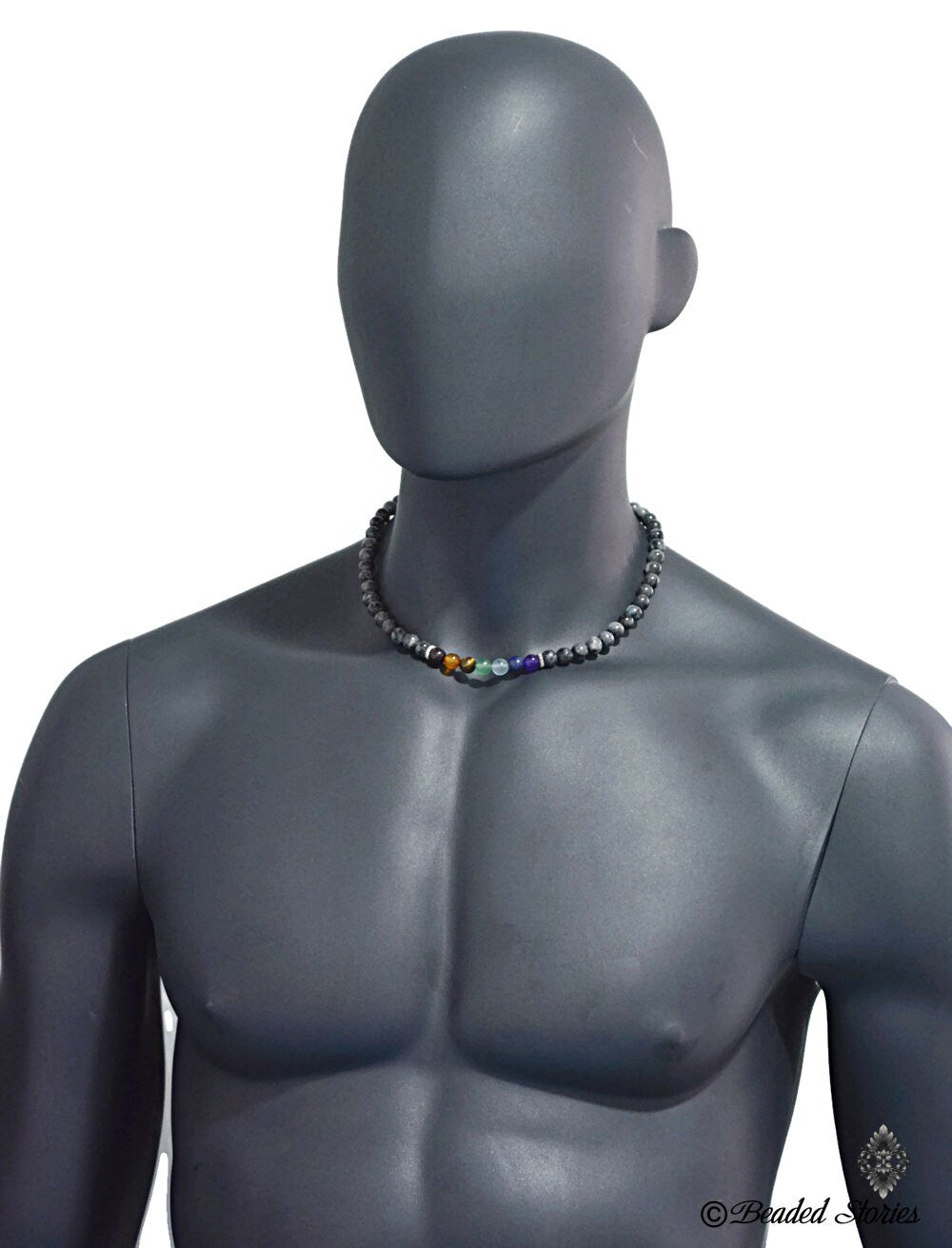 Men’s 7 Chakra Beaded Necklace, Handmade Gemstone Choker, 8 mm Adjustable